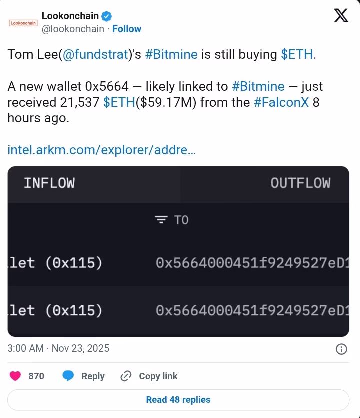 Bitcoin mining company BitMine purchased 21,537 ETH worth approximately $70 million, bringing its total Ethereum holdings to over 3.5 million ETH—roughly 3% of the cryptocurrency’s circulating supply, according to blockchain analytics firm Lookonchain.