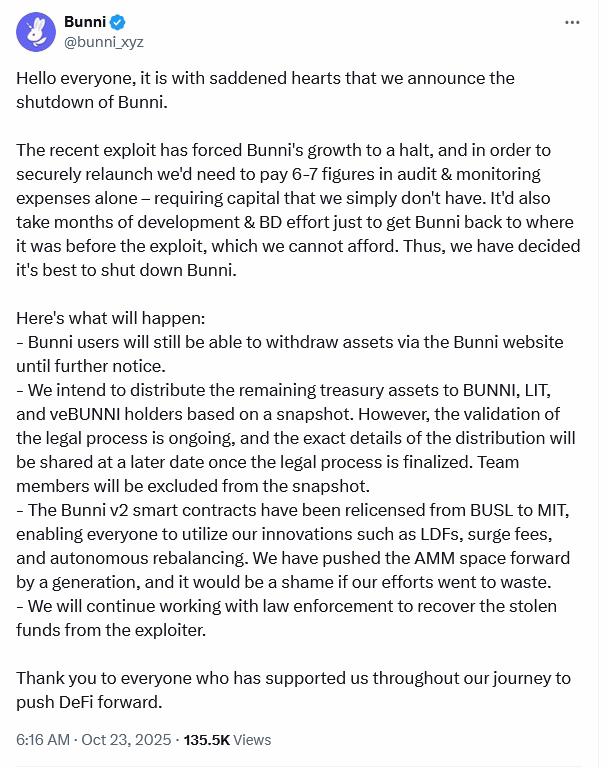 “The recent exploit has forced Bunni’s growth to a halt, and in order to securely relaunch, we’d need to pay 6–7 figures in audit and monitoring expenses alone — requiring capital that we simply don’t have,” — Bunni DEX team, in an X post.