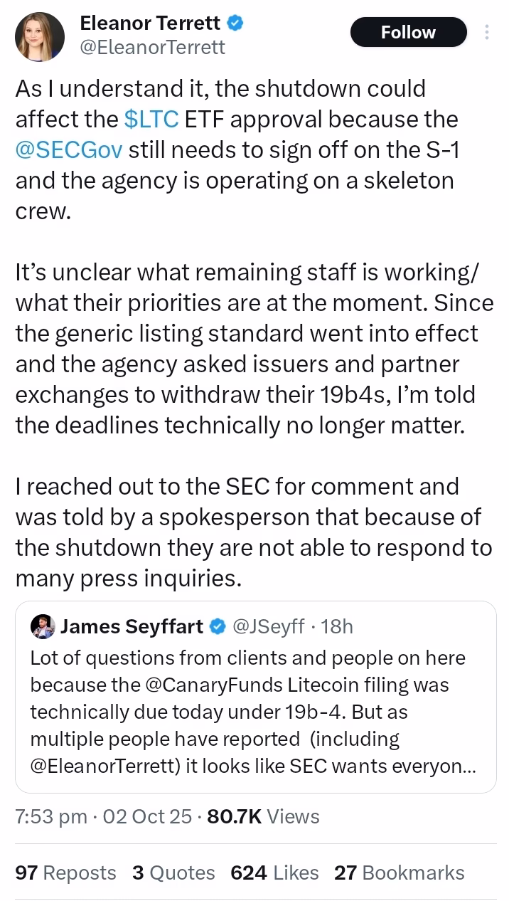 ETF analyst Eric Balchunas likened the current situation to a temporary setback. He called the delay “more of a rain delay,” suggesting the Canary Capital spot Litecoin ETF decision is likely to move forward once normal agency functions resume.
