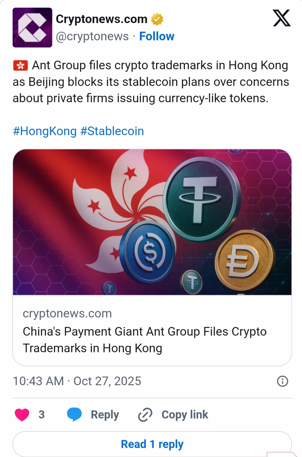 Following mid October directives from the PBoC and the Cyberspace Administration of China, Ant Group and JD.com halted their Hong Kong stablecoin issuance plans. Officials reminded companies that only the state may issue currency warning that private stablecoin ventures could facilitate crypto money laundering schemes.