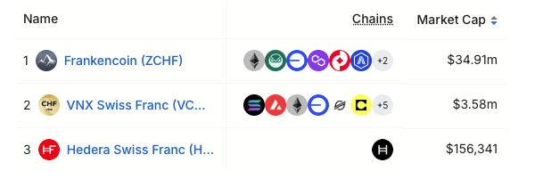 Data from DefiLlama indicates at least three CHF-pegged stablecoins are currently active: Frankencoin (ZCHF), VNX Swiss Franc (VCHF) and Hedera Swiss Franc (HCHF).