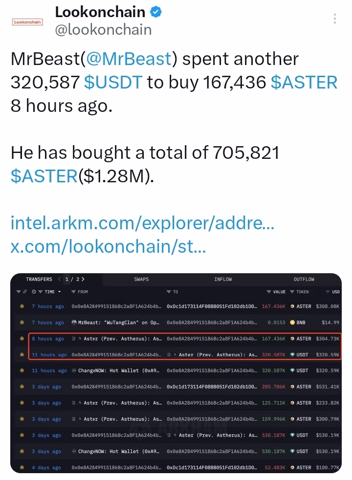 Lookonchain, a blockchain analytics platform, confirmed the purchase of 167,436 Aster tokens for $320,587 USDT. This follows an earlier investment made just two days prior, when MrBeast acquired more than 538,000 tokens. His average entry price now stands at $1.87 per token.