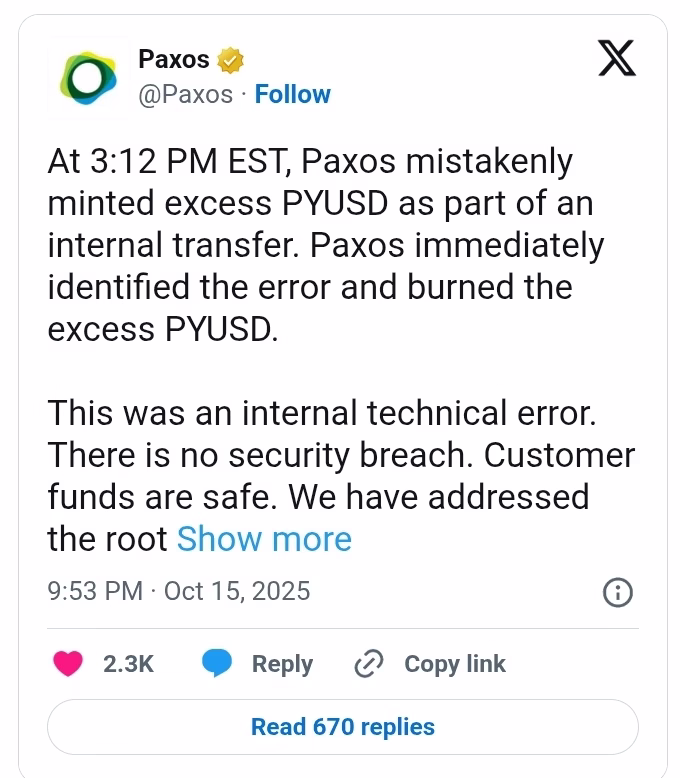 “This was an internal technical error. There is no security breach. Customer funds are safe. We have addressed the root cause,” — Paxos, in a public post on X, October 15, 2025.