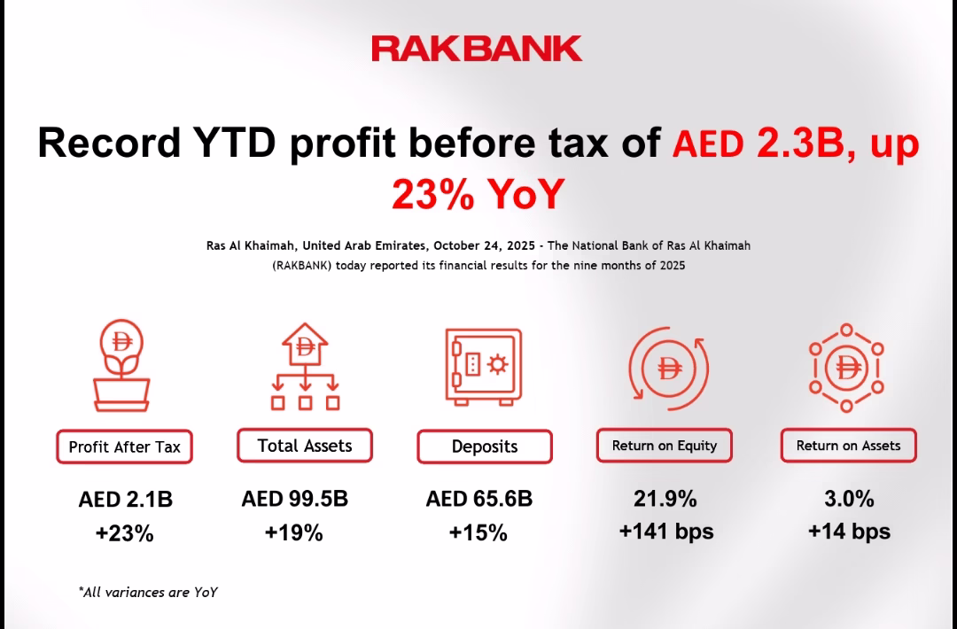 Ras Al Khaimah, UAE, October 24, 2025 — National Bank of Ras Al Khaimah (RAKBANK) today announced record financial results for the nine months ending September 2025, with profit before tax reaching AED 2.3 billion ($626 million), representing a 23% increase year-over-year.