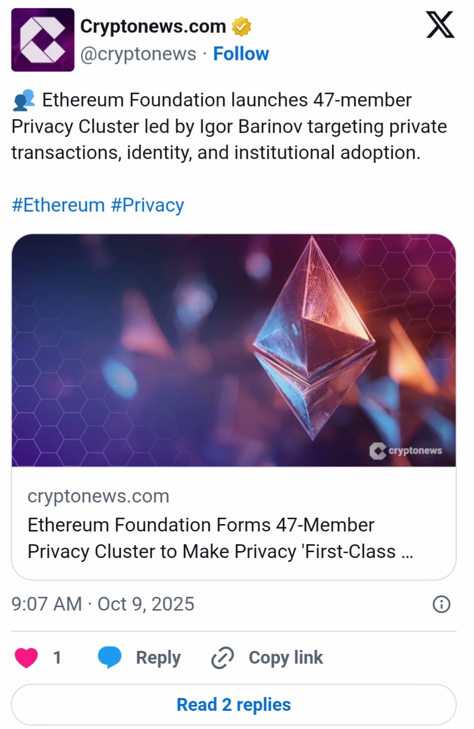 The Ethereum Foundation’s newly formed 47-member Privacy Cluster coordinated by Blockscout founder Igor Barinov further demonstrates the ecosystem’s shift toward practical privacy and scalability.