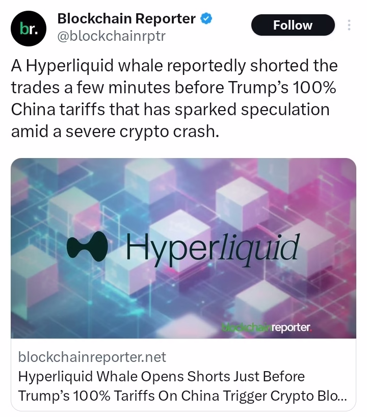 Users cited a Hyperliquid address that opened $1 billion in BTC and ETH shorts just 30 minutes before Trump’s announcement, reportedly netting $193 million in profit. Threads accused large institutional traders of orchestrating a “coordinated reset” to buy crypto cheaply after forcing retail liquidation.