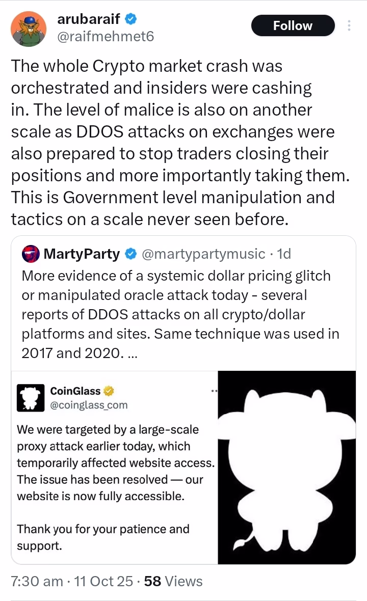 Others alleged government-level manipulation. One widely shared post claimed exchanges were hit with timed DDoS attacks to trap traders in losing positions. Another accused market makers of “planned downtime” to scoop up assets during volatility.